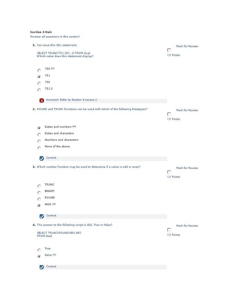 An asterisk (*) indicates a correct answer. (answer all questions in this section) 1. Round and trunc functions can be used with which of the following datatypes? (answer all questions in this section) 1. section 1 quiz (answer all questions in this section) 6.